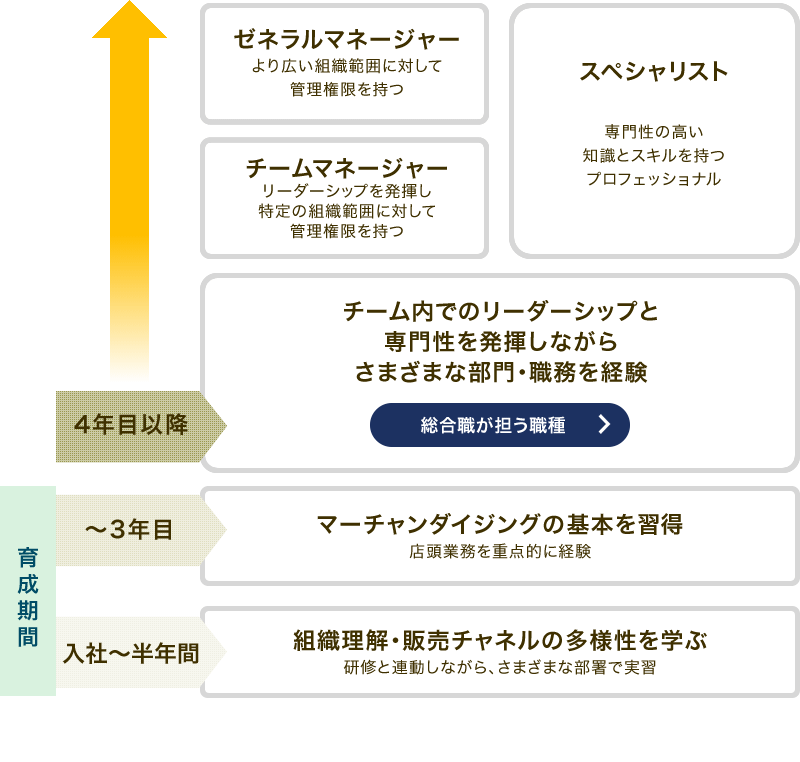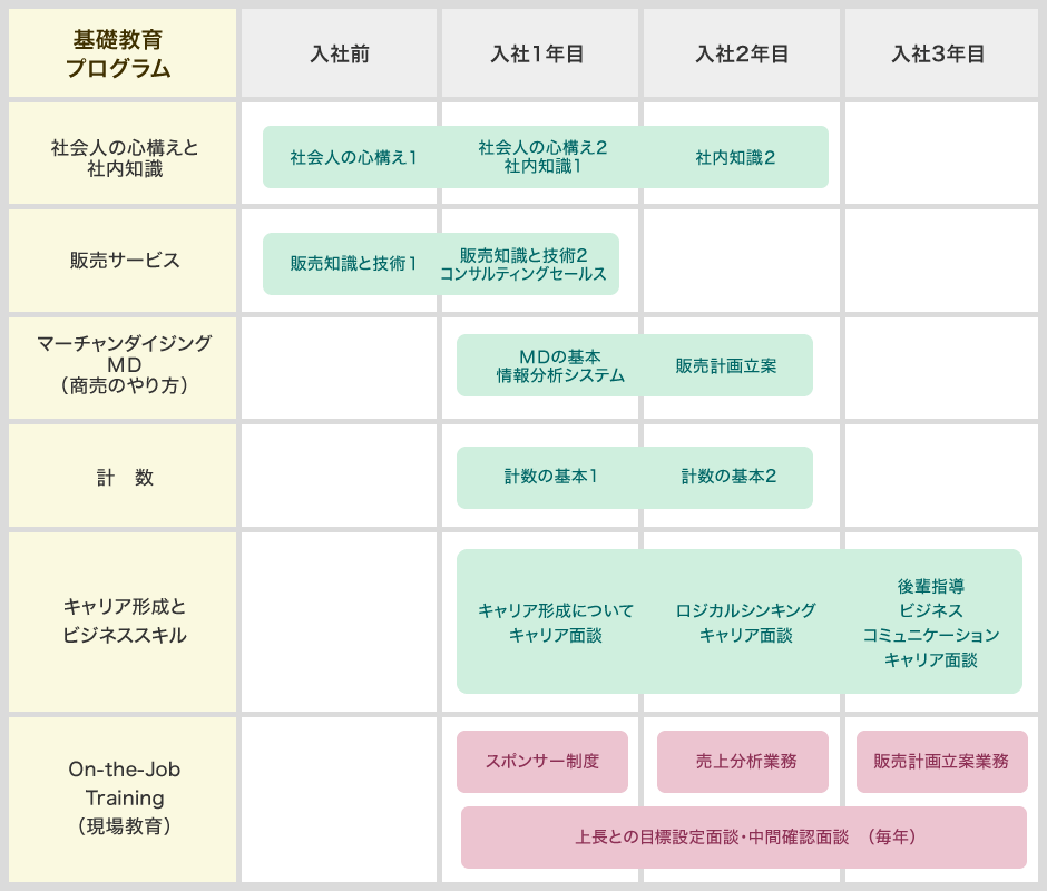 각 영역(예:부인복·리빙·식품 등)에서 보다 전문적인 컨설팅 세일즈를 실시하기 위해 담당 매장 내에서 전문 지식과 기술 습득을 위한 연수를 실시하고 있습니다.
